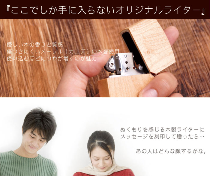 商品情報 【 木製オイルライター メープル(カエデ)】 ■オリジナルの名入れをして世界に一つの木製オイルライターを 男性へのプレゼントに大人気 さらに珍しい木製のオイルライターです ■メープルの木を使用した、木のぬくもりを感じるオイルライター ずーっと使ってもらいたいからこだわり素材 とても堅く傷つきにくいメープルは、使い込むほどにつやが増します 金属と違い、あたたかみを感じる木製ライターにメッセージを彫刻して 愛煙家の彼氏や旦那さんへプレゼントすれば、一層思いが伝わります 木の温もりと心を贈る「木製品専門店 モクゾウ」 仕様 / サイズ ■材質:メープル(カエデ) ■高さ6.5×幅4.2×厚み1.7(cm) ■重さ:65g 配送方法 宅配便/メール便不可 ※ご注文の際、メール便をご希望の場合は【宅配便】へ変更させていただきます。