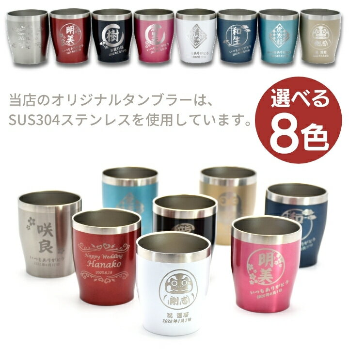 シャンパンゴールド、ロイヤルネイビー、プラチナシルバーの3色に加え、 当店オリジナル!メタリックなアクアブルー、ワインレッド、シャインブラック、 パールホワイト、キュートピンク、計8色があります! シンプルな形が手に馴染みやすく、保冷にも保温にも優れているので、一年を通してお使い頂けます! 名前、メッセージ、日付を彫刻できるので、記念日や母の日、父の日、敬老の日などに最適な贈り物です♪